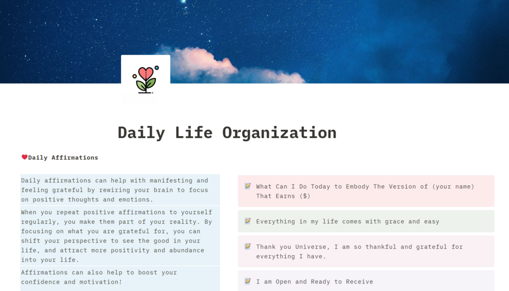 A notion template that will organize your day, give you affirmations to boost your confidence and abundance and a daily task planner